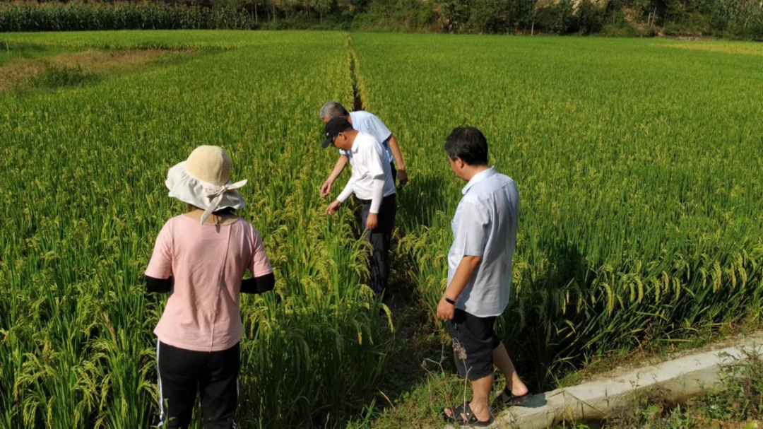 宁强农技干部调查水稻生长情况