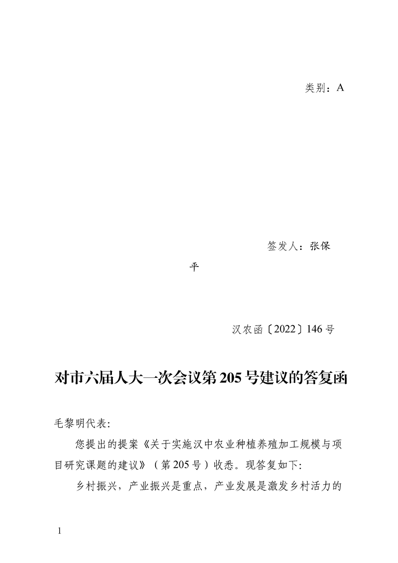 | 内容概述: | 汉农函〔2022〕146号 对市六届人大一次会议第205号建议的答复函 | ||