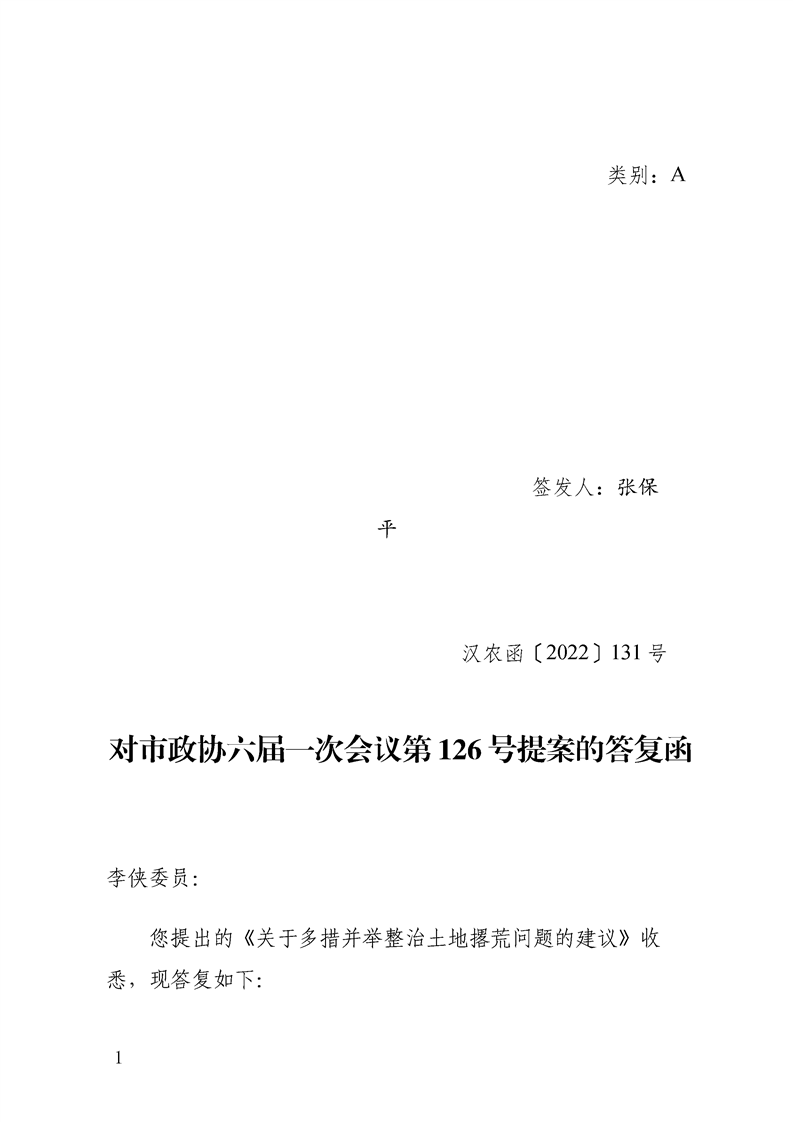 | 内容概述: | 汉农函〔2022〕131号 对市政协六届一次会议第126号提案的答复函 | ||