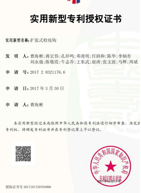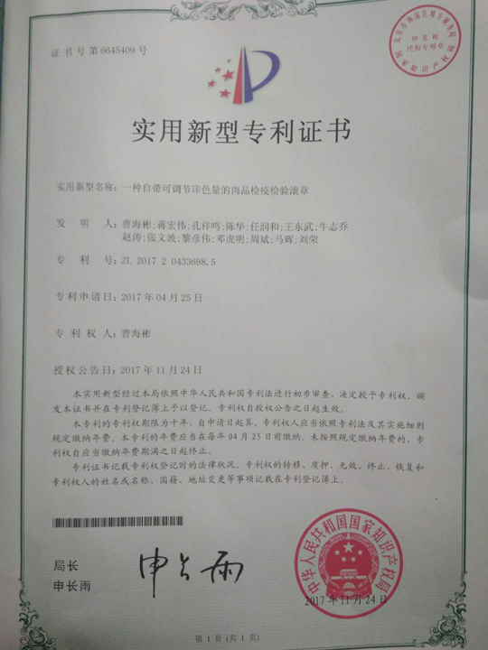 日前,汉中市汉台区畜牧兽医中心在 “屠宰检验检疫钩”专利基础上,积极进行检疫检验工具再改进创新,曹海彬等同志完成“一种自带可调节印色量的肉品检疫检验滚章”(专利号ZL201720433698.5)与“扩张式检疫钩”(专利号ZL20172032117606)国家专利授权书。