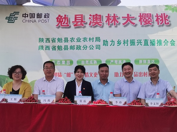 5月10日上午,在周家山镇澳林大樱桃种植园里,主播们正通过中国邮政勉县分公司拼多多优臻良品直播间给各位网友们介绍勉县大樱桃。这也是勉县农业农村局和邮政分公司今年开展的第四场惠农助企直播活动。县农业农村局副局长李文智、刘锋,邮政分公司、农技中心、农业信息中心参加直播。