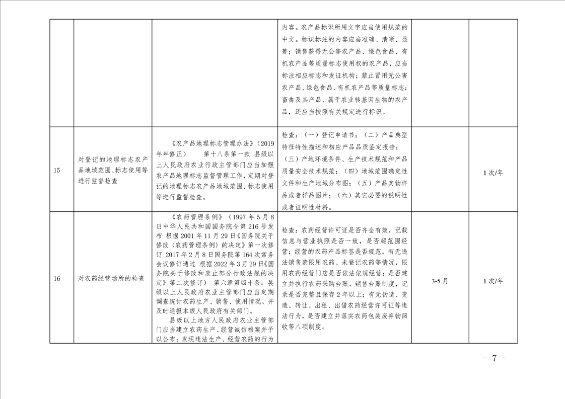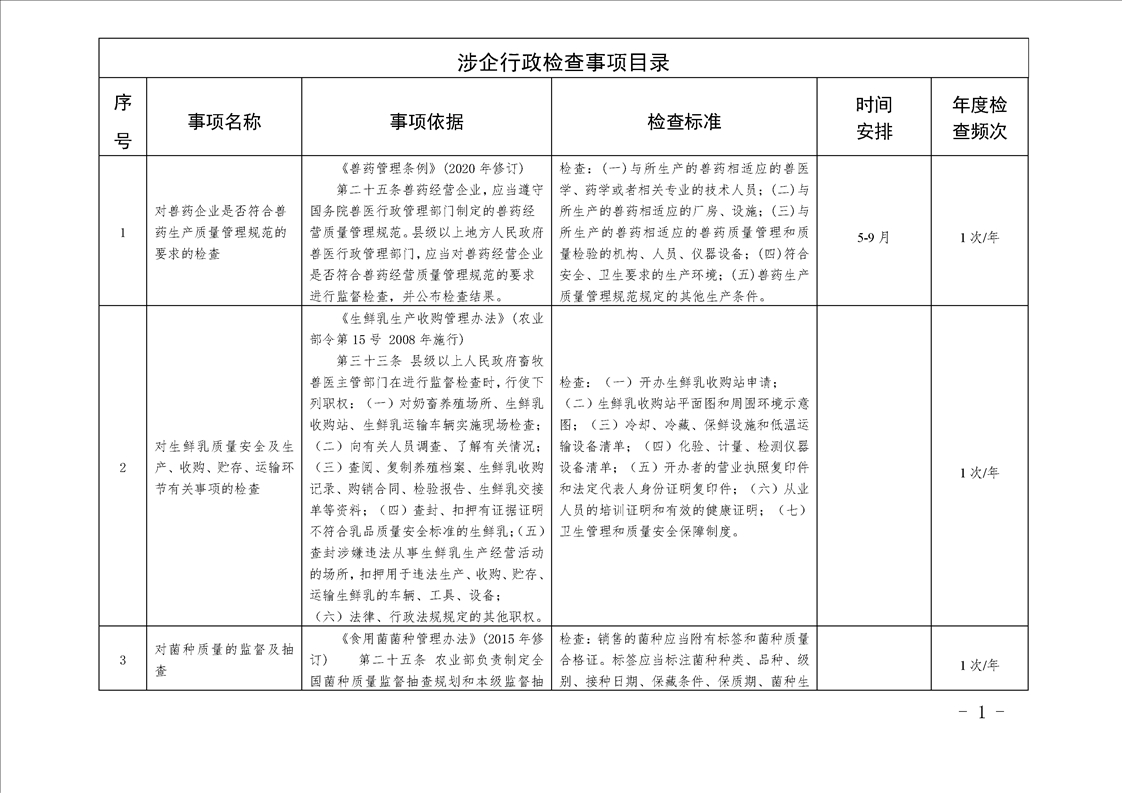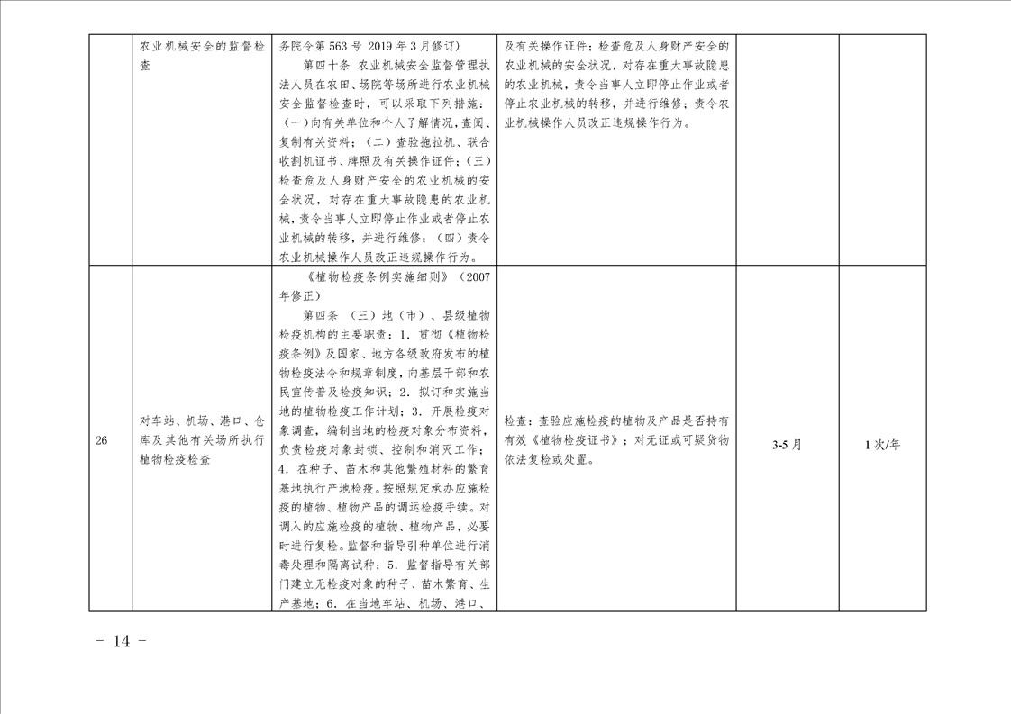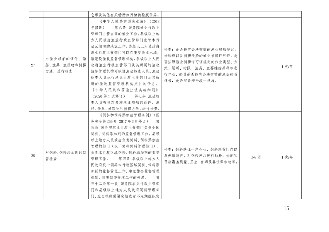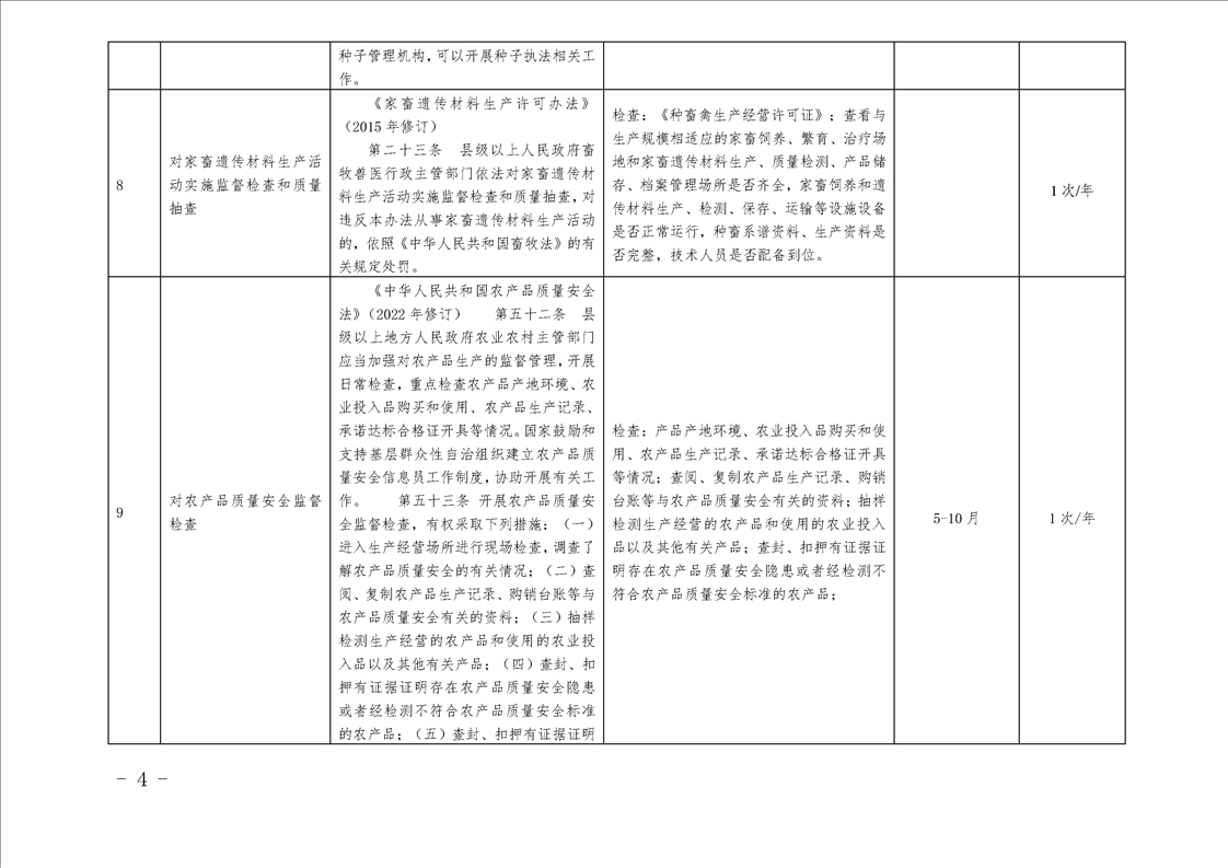 汉中市农业农村局行政检查事项目录