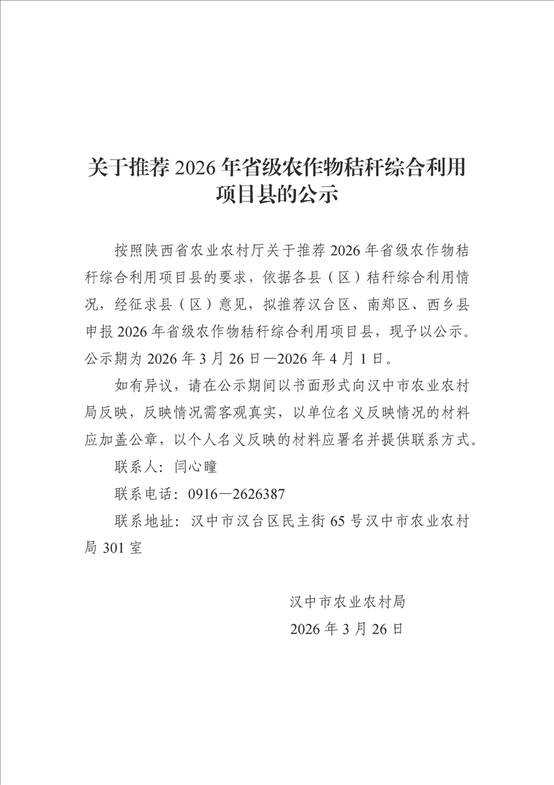 汉中市农业农村局关于推荐2026年省级农作物秸秆综合利用项目县的公示