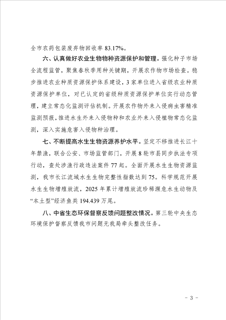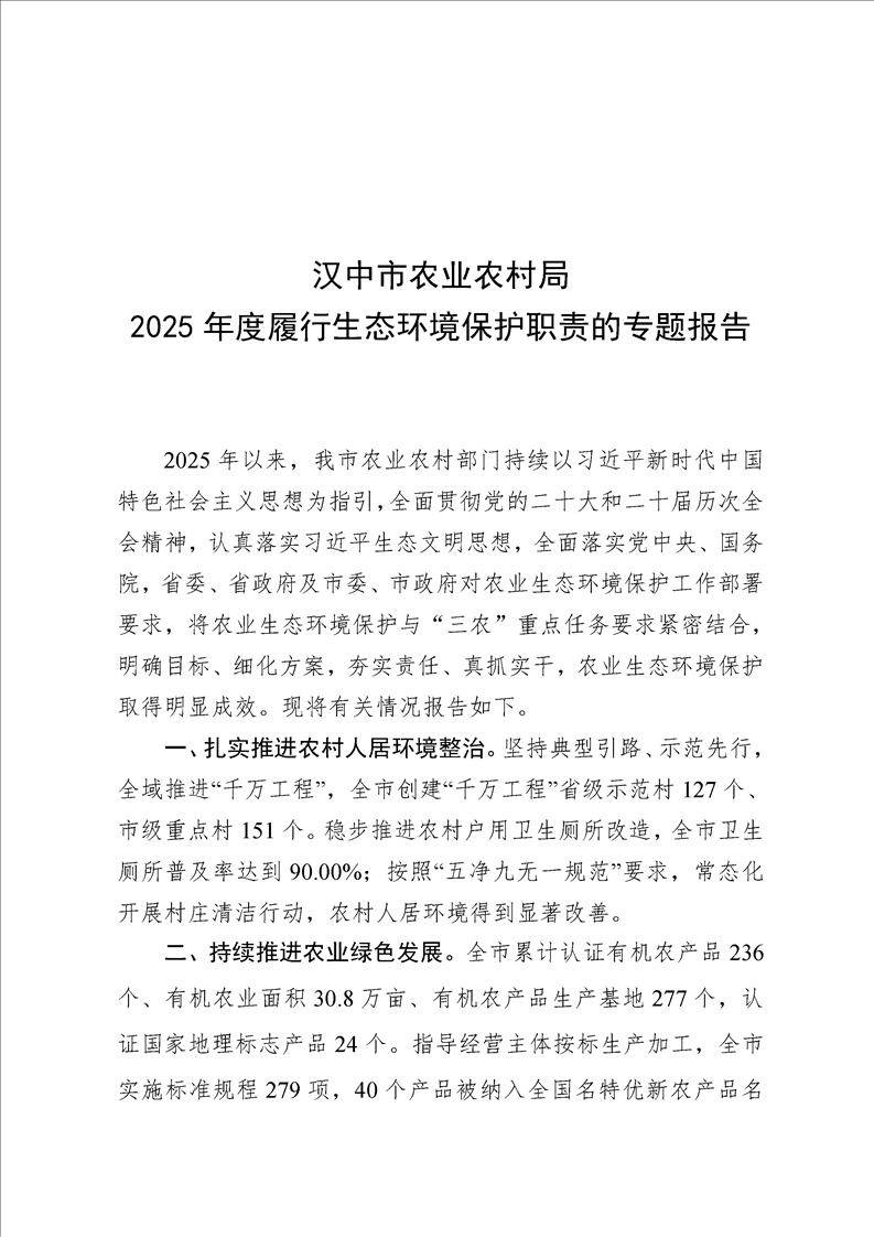 汉中市农业农村局2025年度履行生态环境保护职责的专题报告